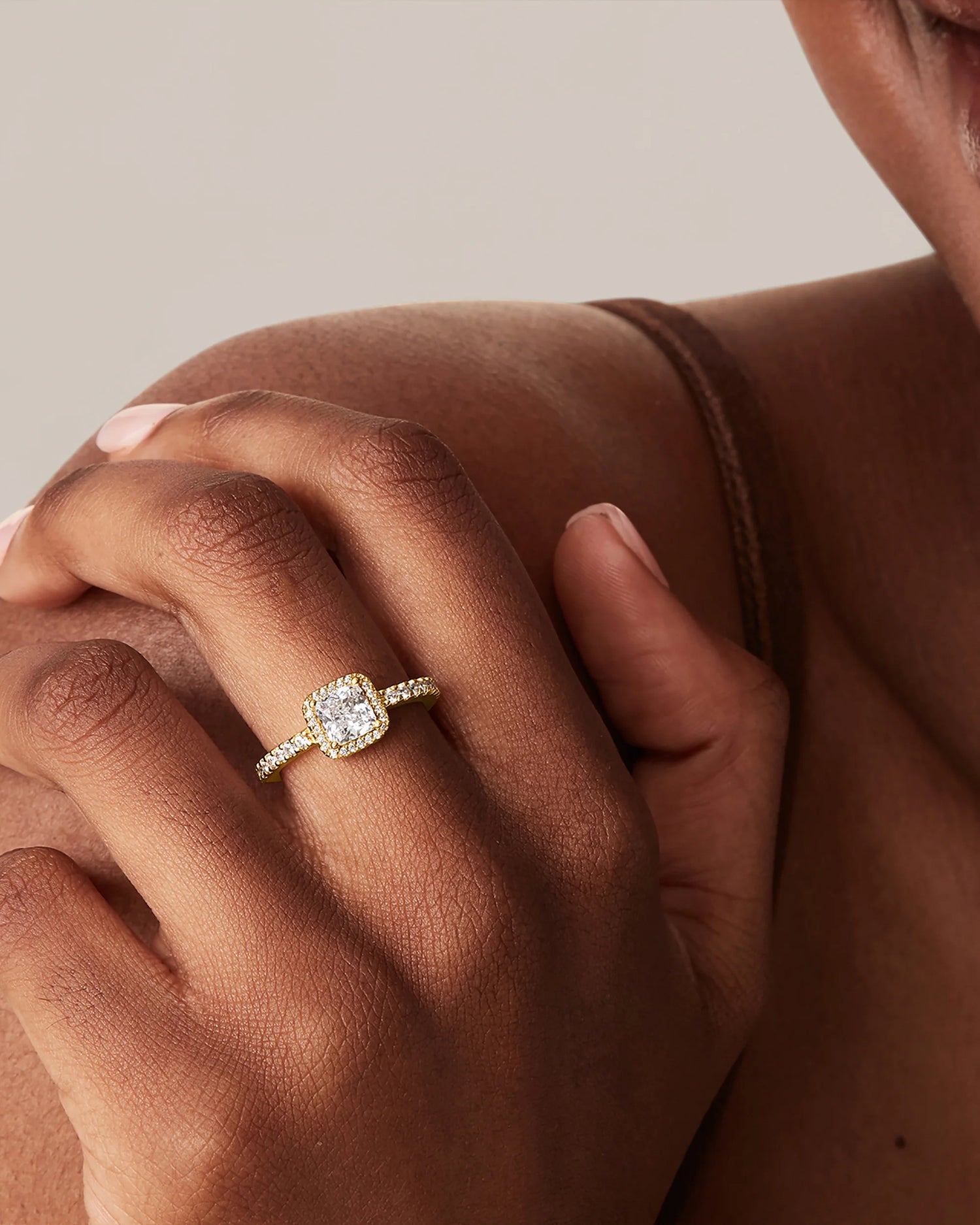 "This ring has become my go-to travel accessory. I leave my real pieces at home and take this instead—it looks just as elegant but I don’t worry about losing it. The square halo design is a nice change from my usual styles. Really love the shimmer it gives off in sunlight."