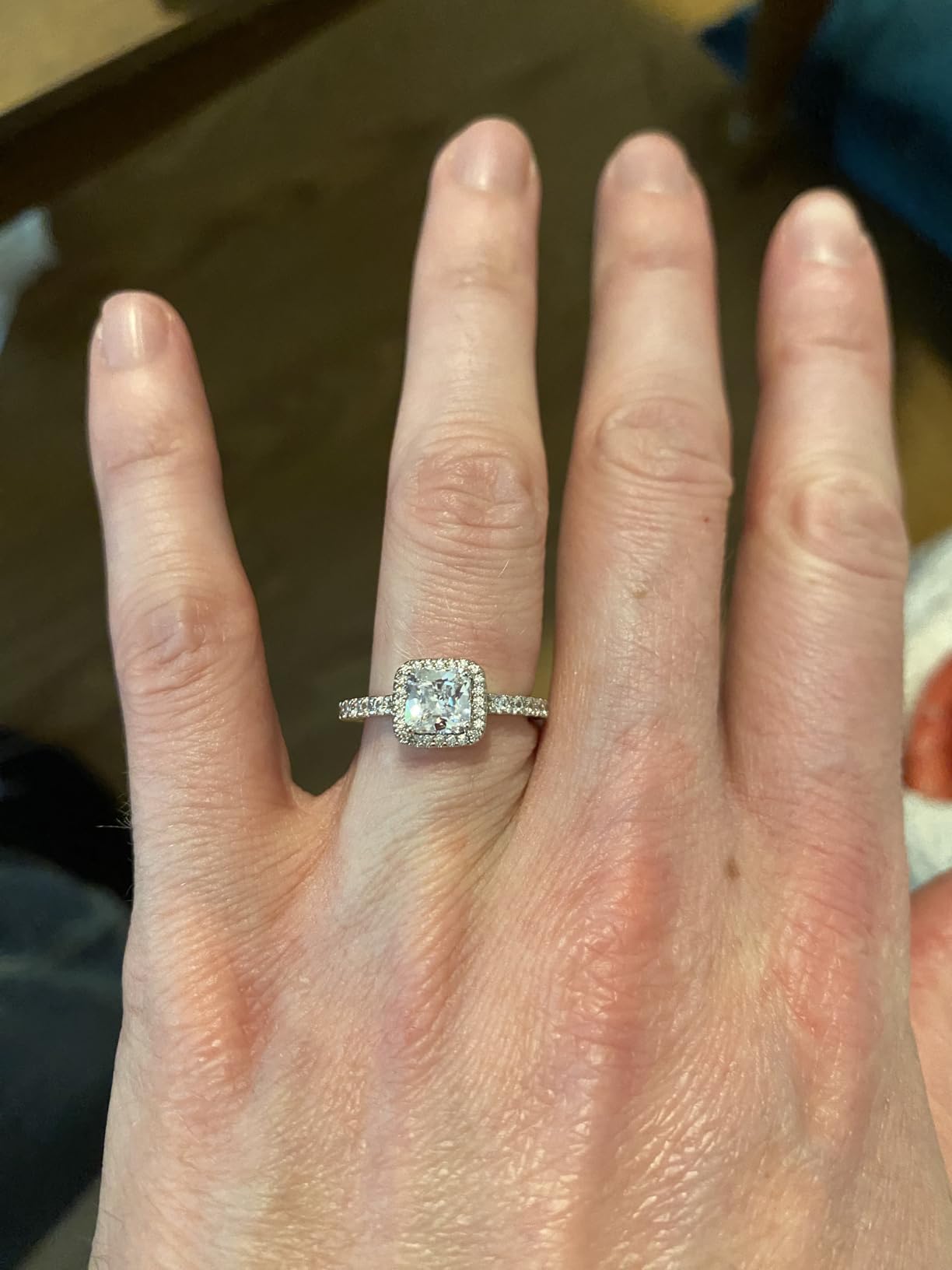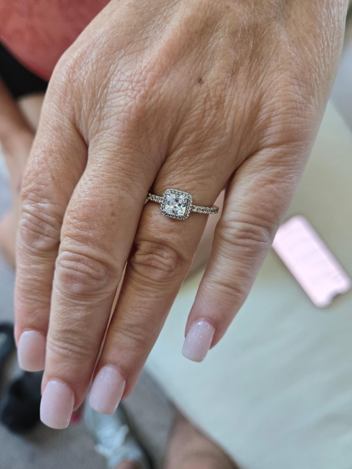 Purchased this as a travel ring for when I don't want to wear my diamond, and honestly, sometimes I prefer this one! The square halo design is modern yet timeless, and nobody can tell it's not a real diamond. Exceptional value!