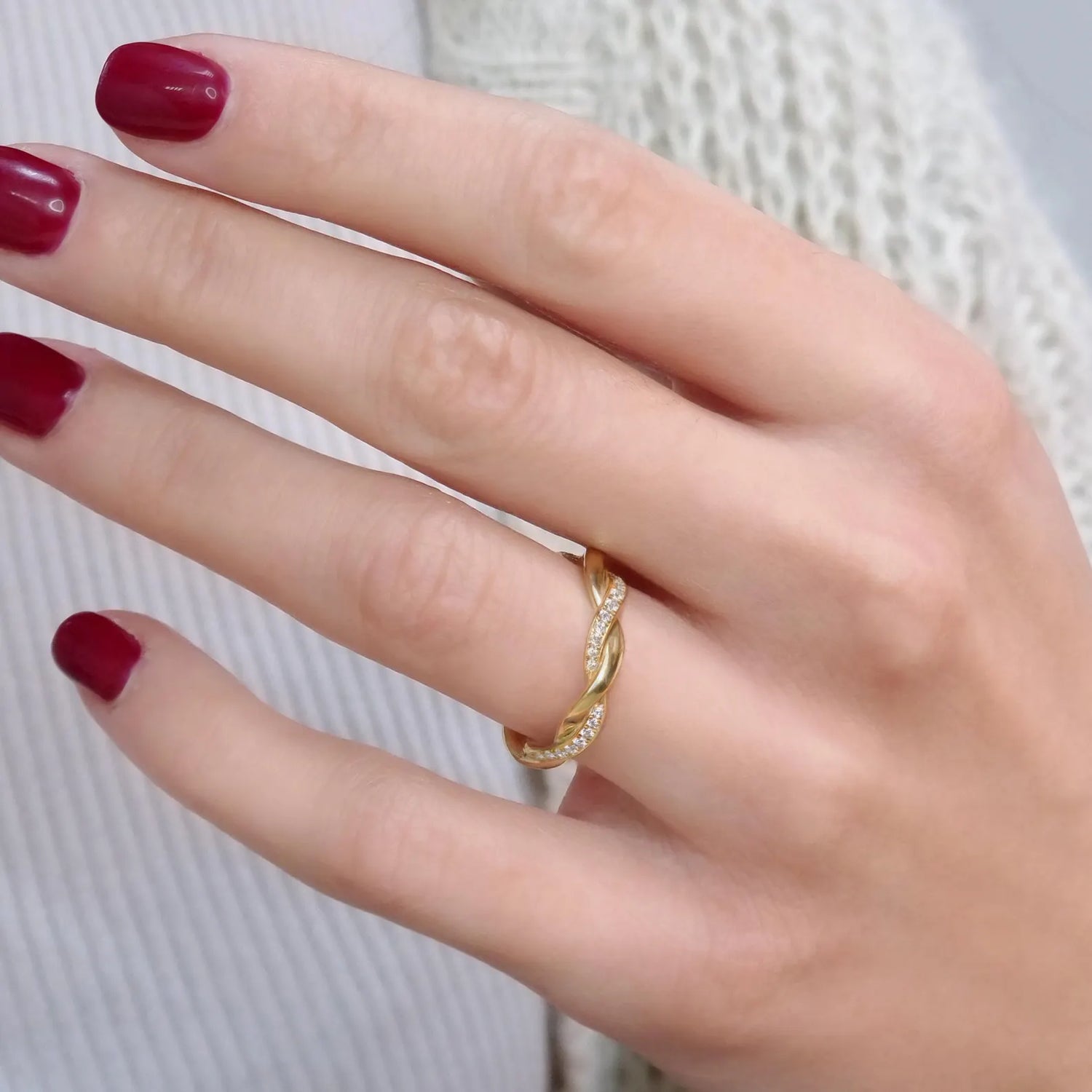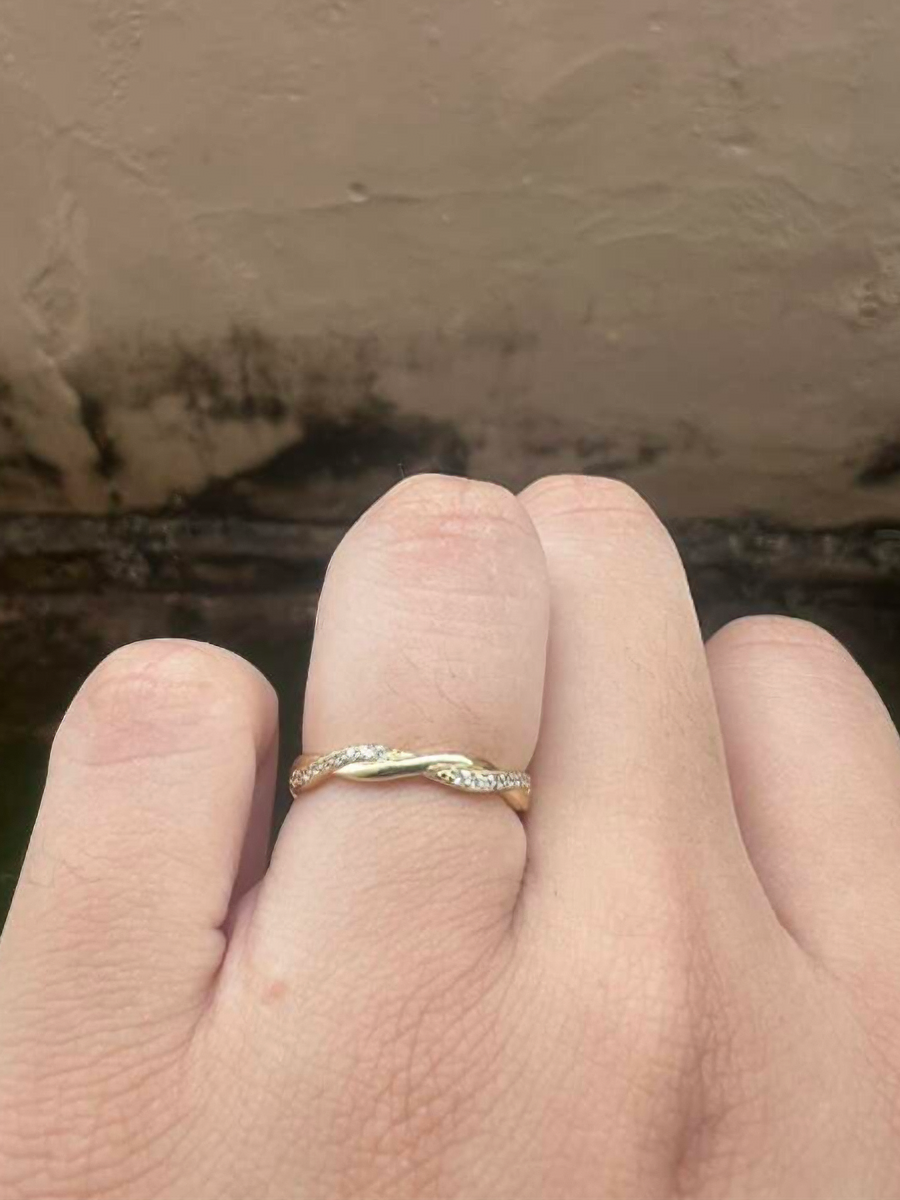 "I bought this ring as a gift to myself, and I couldn’t be happier with it. It’s simple, yet has such an elegant design. The braided gold is so classy, and the cubic zirconia makes it pop. It’s perfect for both casual and formal occasions. I’ve worn it daily, and it still looks as good as new. A real keeper!"