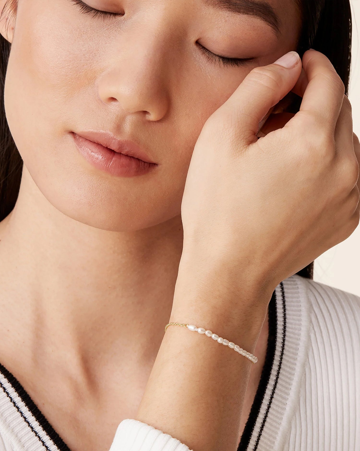 The elegant simplicity of this bracelet is what makes it so special! The pearls have a beautiful luster and the gold chain is the perfect weight. It looks incredibly high-end and makes me feel put together every time I wear it.