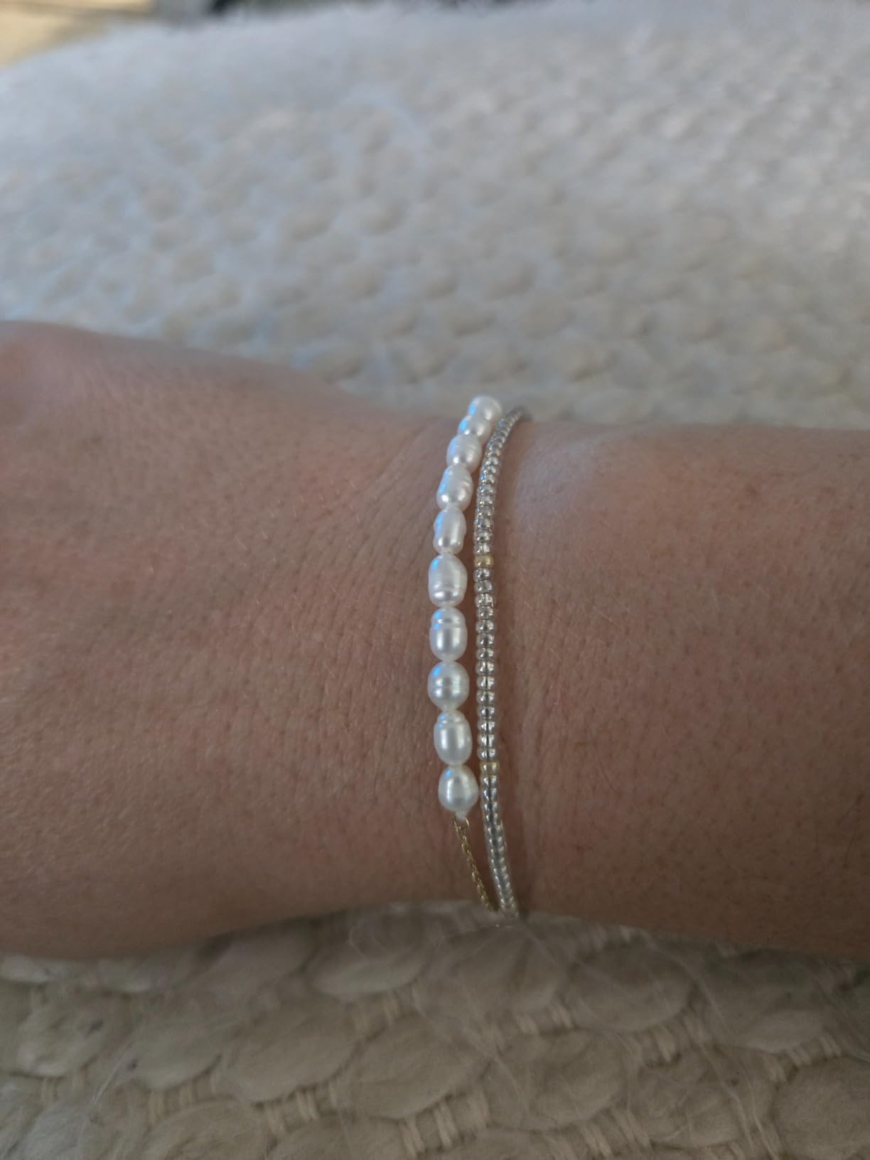 "I bought this bracelet to wear for my wedding anniversary, and it was the perfect addition to my outfit. The combination of gold and pearls gives it such a timeless feel. It’s lightweight, so I can wear it all day without discomfort. It fits so well and the clasp is easy to use. If you're looking for something luxurious but not over-the-top expensive, this is it. It’s become my new favorite piece of jewelry!"