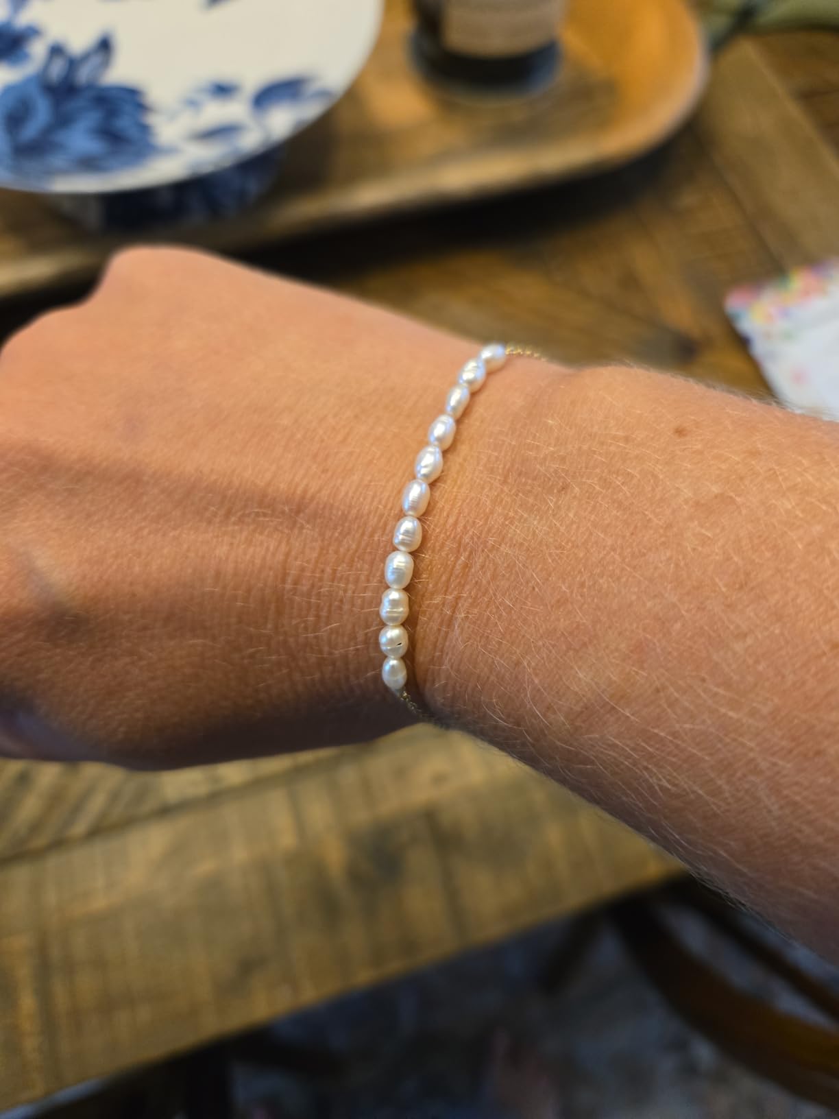 I'm genuinely impressed with the quality of this bracelet! The pearls are well-matched and the gold has a beautiful warm tone. The clasp is secure and the chain has a substantial feel despite being delicate. Looks like I spent ten times more!