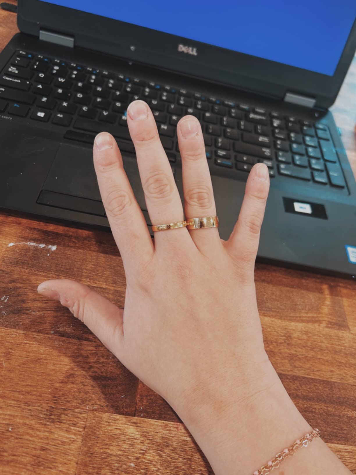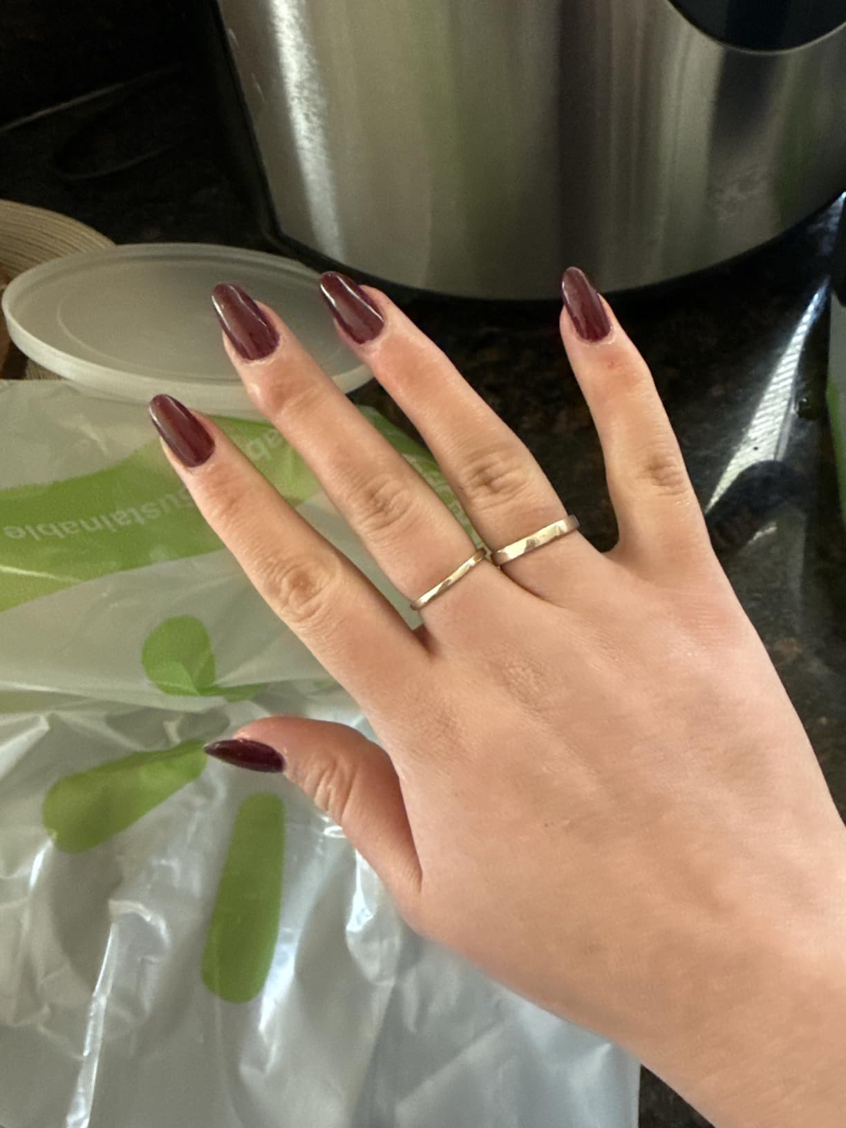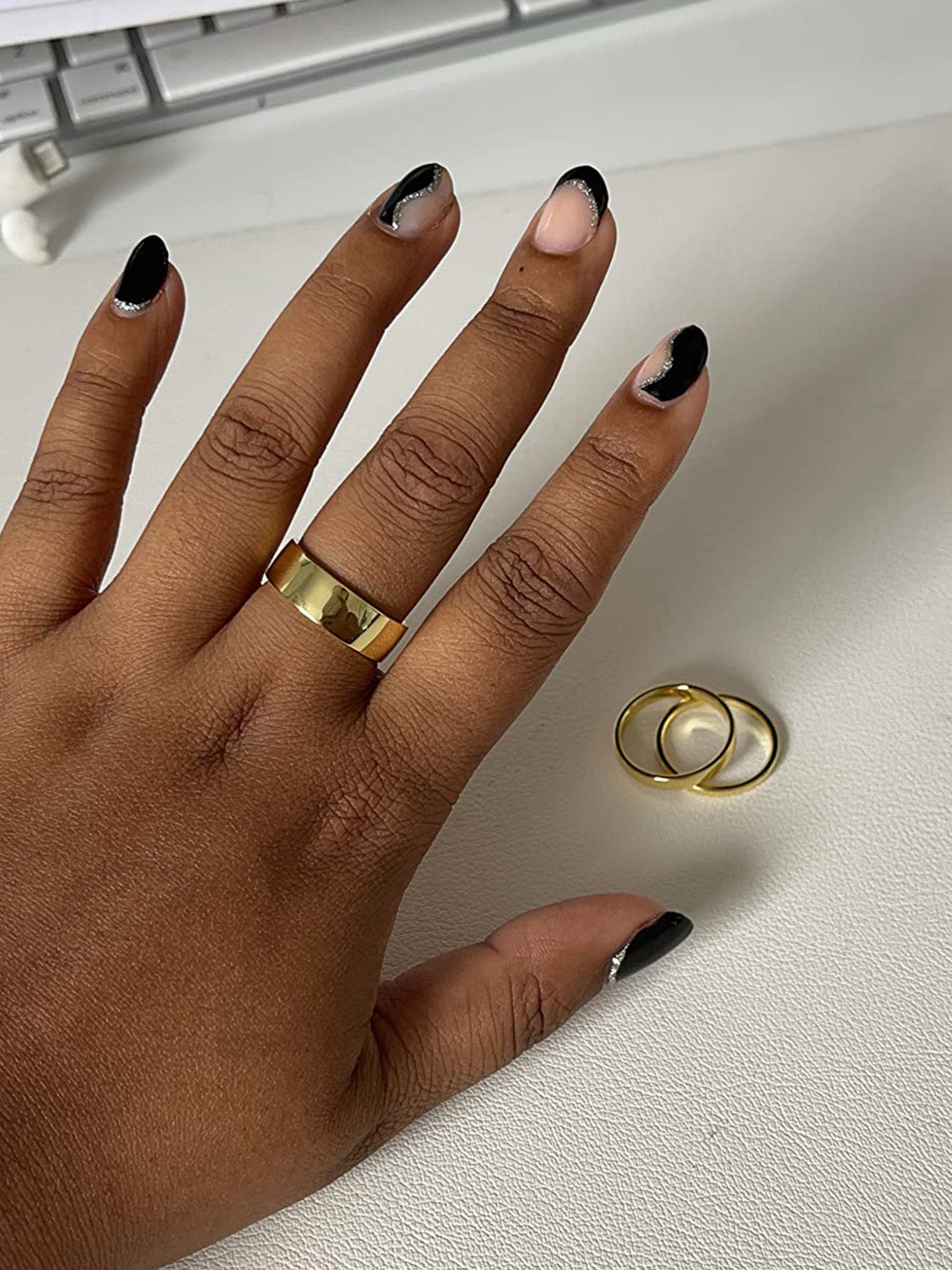 These rings look so luxurious and expensive! The gold finish is beautiful and warm-toned. I love mixing and matching the different widths depending on my mood. They're comfortable enough for everyday wear and haven't turned my finger green at all. They've quickly become my go-to accessory for both casual and dressy outfits.