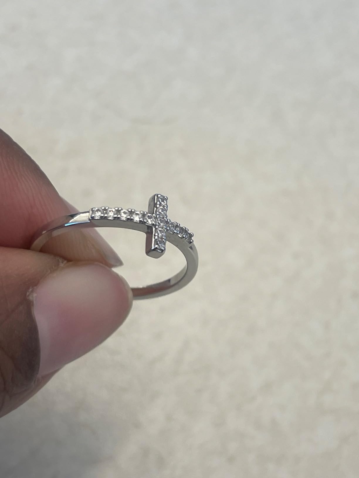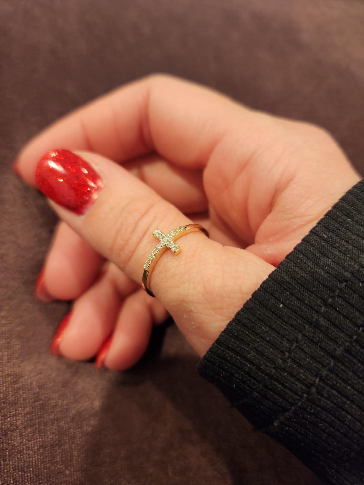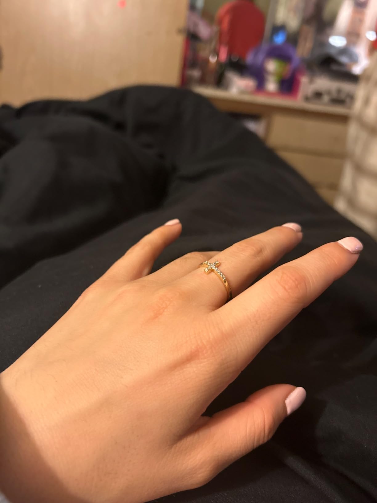 "I bought this ring as a subtle reminder of my faith while working in a fast-paced, corporate job. The sparkle is delicate but noticeable, and the cross shape gives me quiet confidence every time I glance down. I wear it stacked with two plain bands and it looks way more expensive than it is. Also, no irritation on my sensitive skin, which is rare for me!"