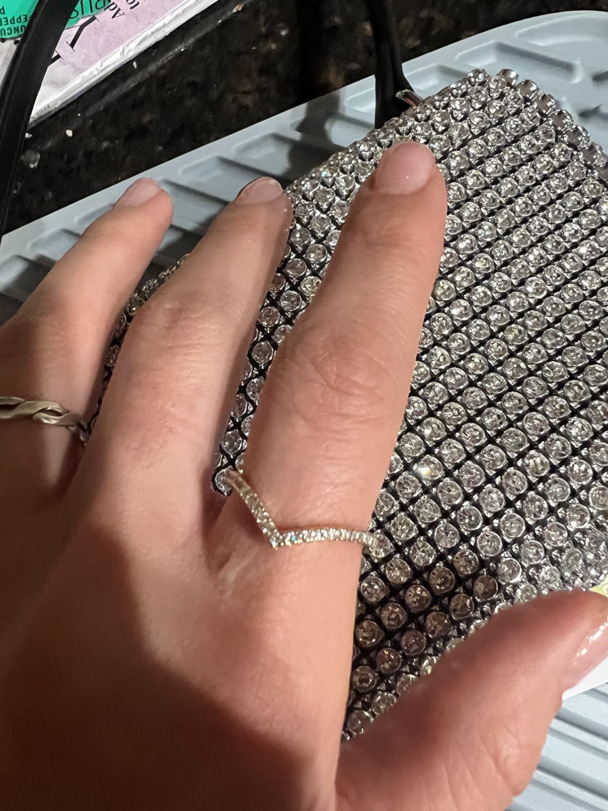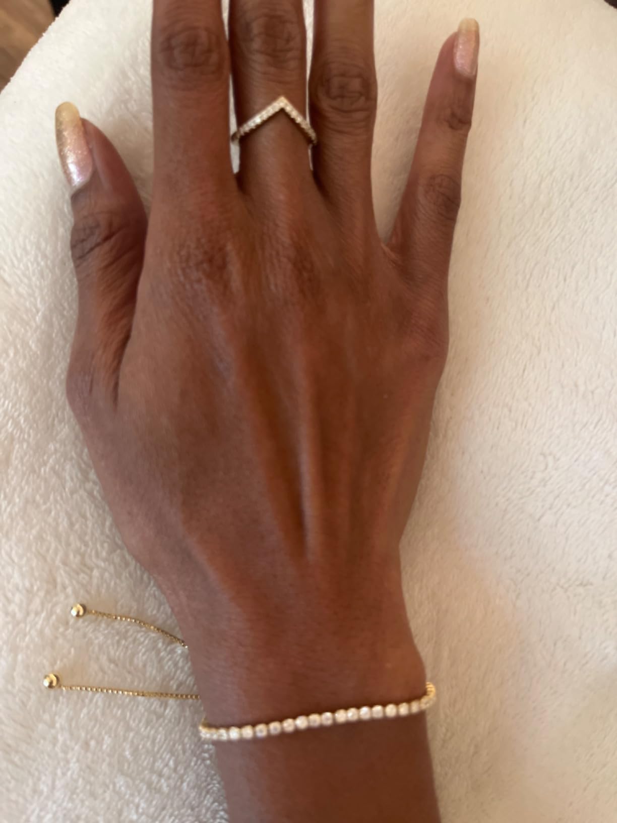 "This Cubic Zirconia V Shape Ring pairs perfectly with my tennis bracelet, creating a cohesive and sparkling look that elevates any outfit. The stones catch the light just like my bracelet, and the 14K gold plating matches beautifully. It’s lightweight and comfortable enough to wear all day, yet stunning enough to turn heads. Together, they make an elegant duo without the luxury price."