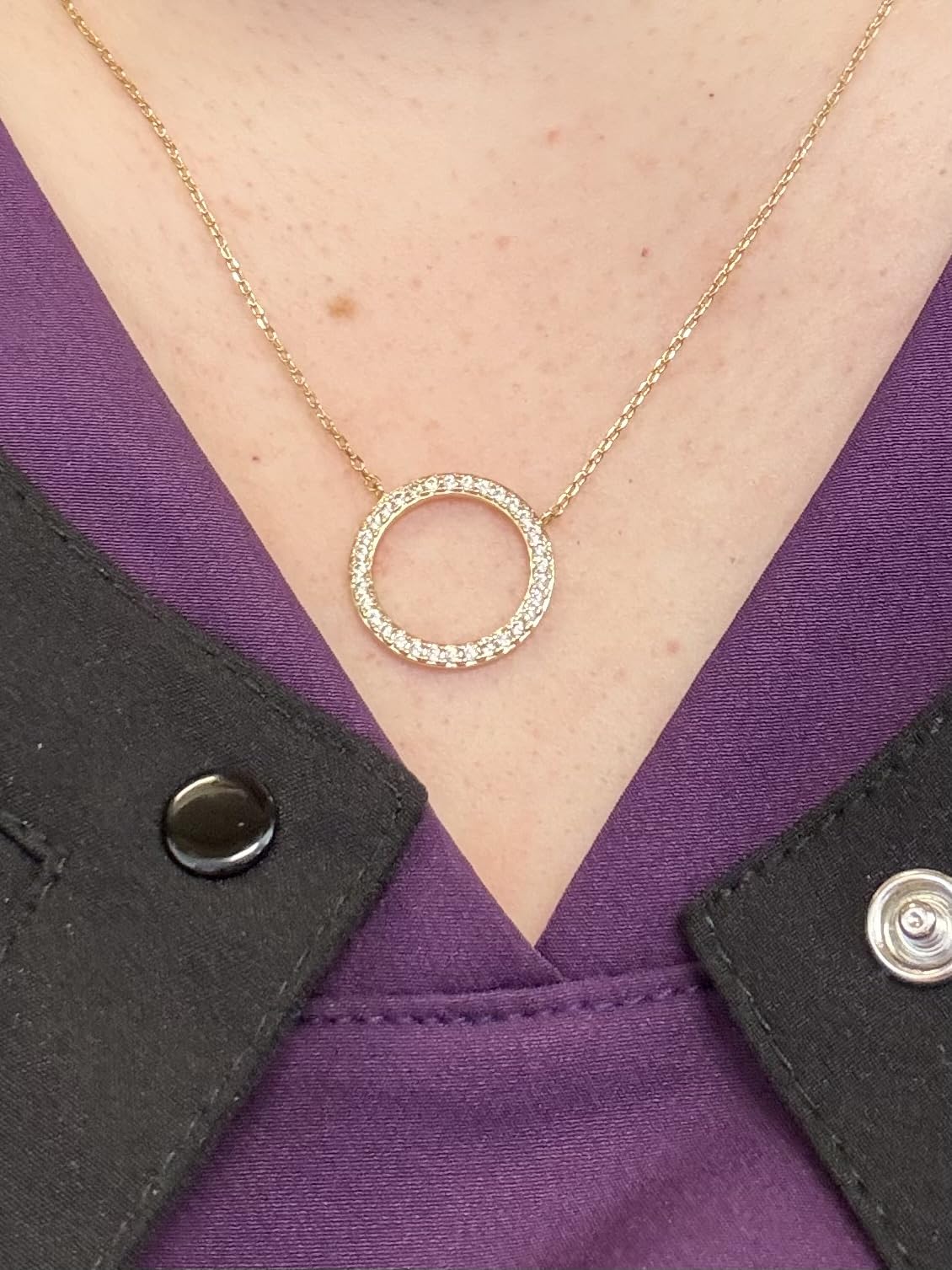 This necklace has a beautiful sparkle to it! The circle design is elegant and the CZ stones catch the light wonderfully. It's versatile for many occasions.