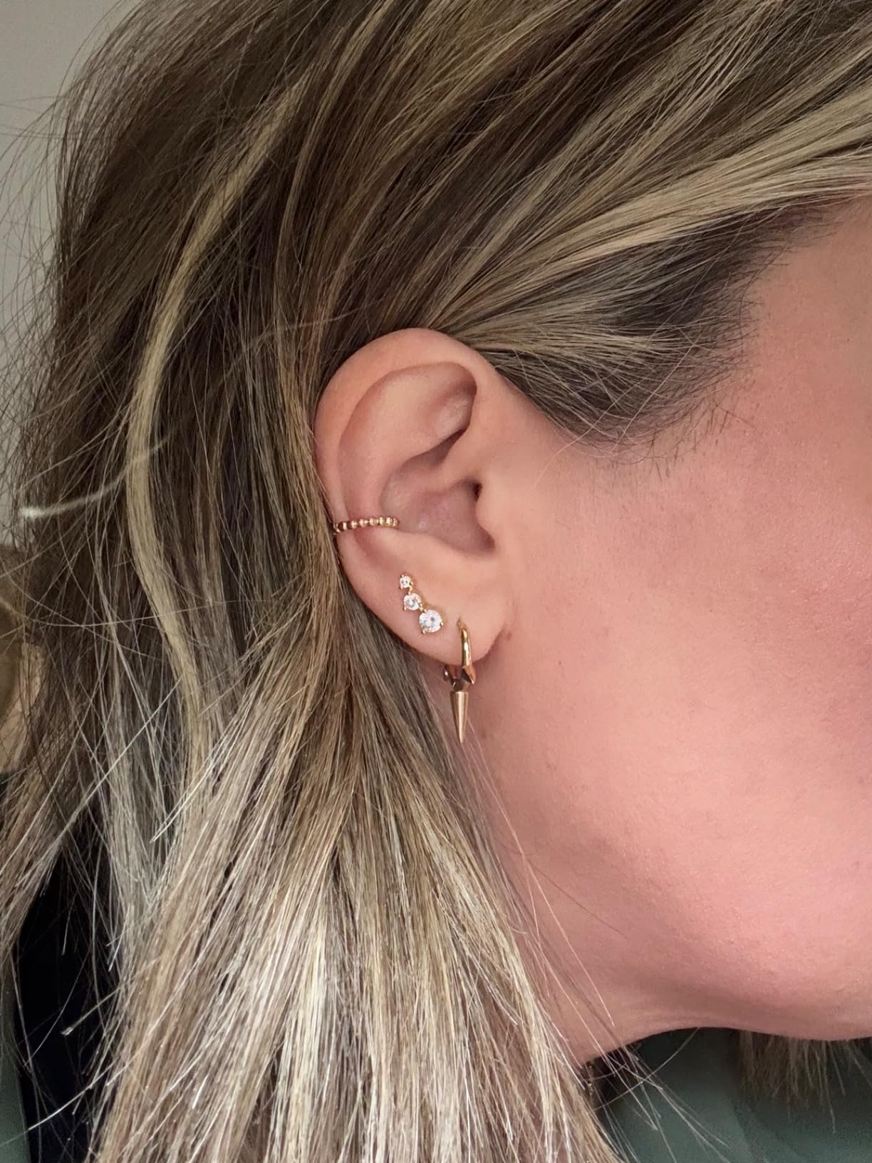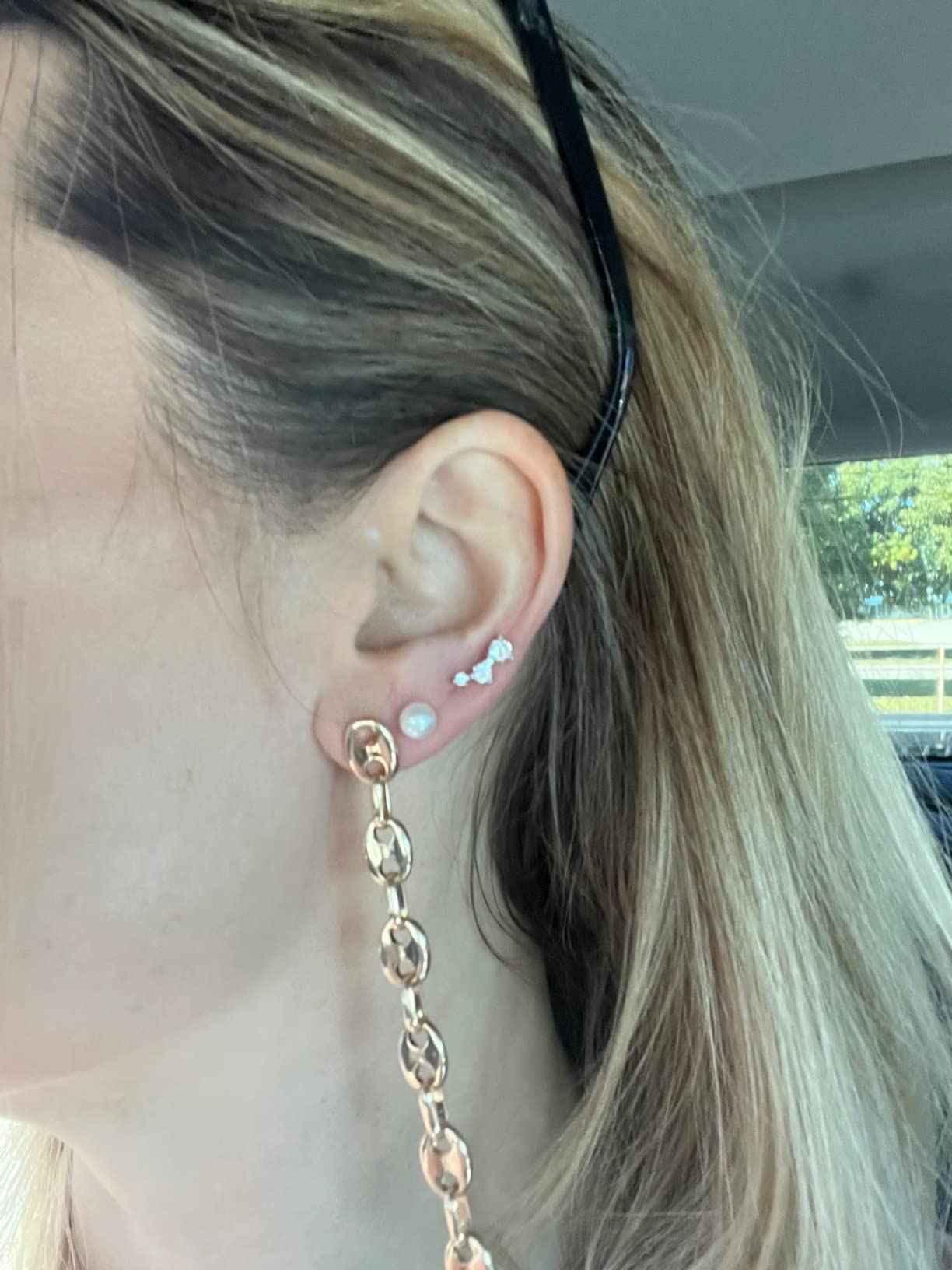 "These pair beautifully with my other earrings! I have multiple piercings and always struggled to find a combo that looked intentional—these climbers changed that. They add a structured, stylish curve that makes my whole ear look styled. The sparkle adds a touch of luxury, and they’re still subtle enough for everyday wear. I’ve already gotten compliments from coworkers and friends alike.."