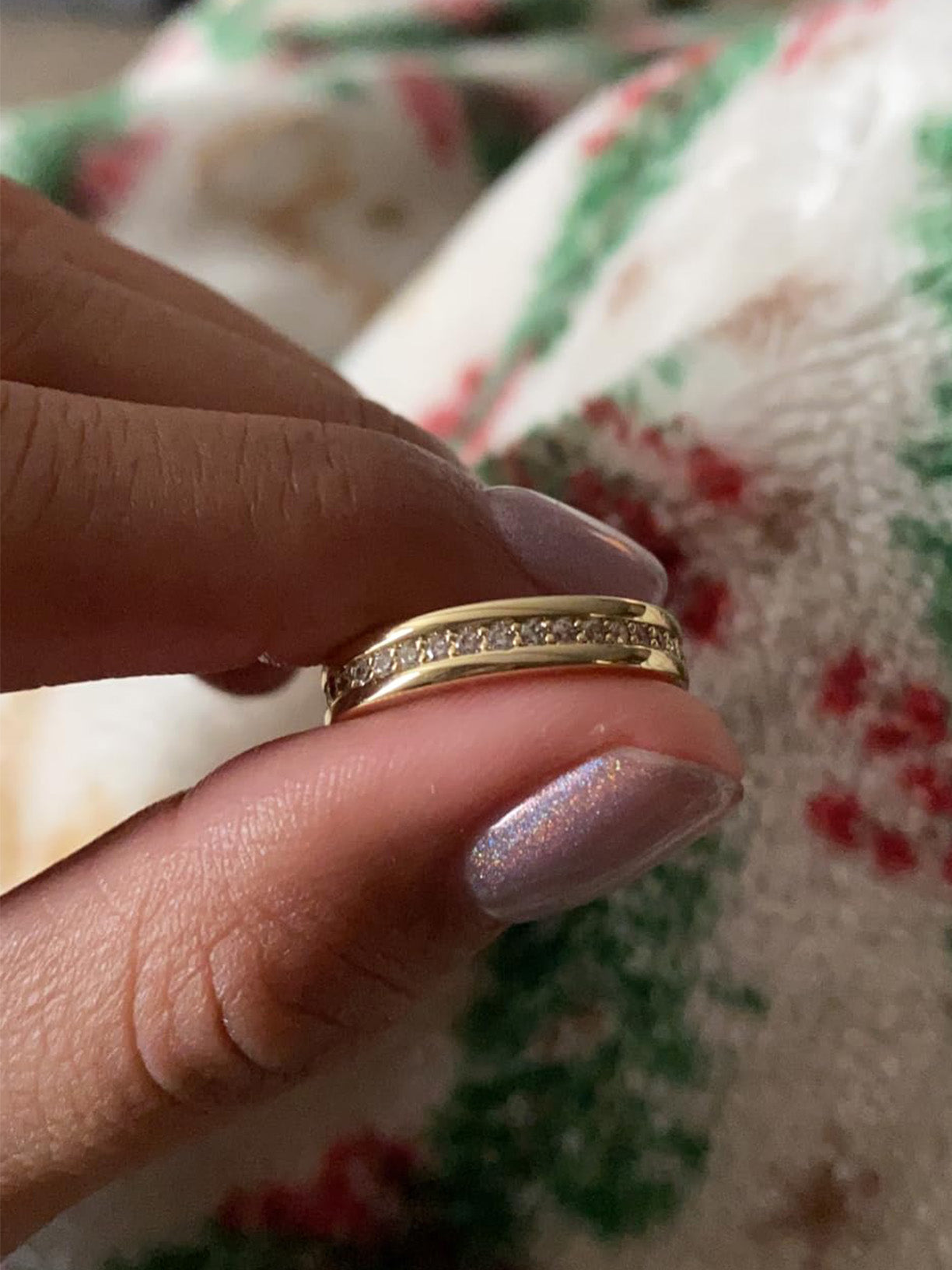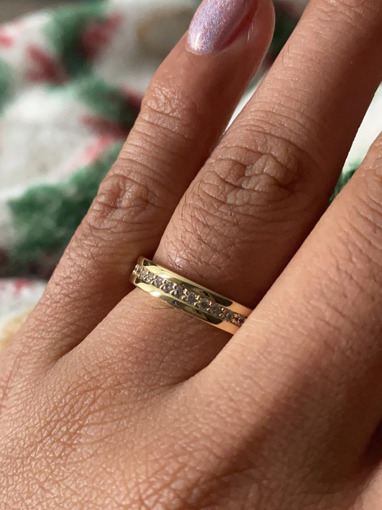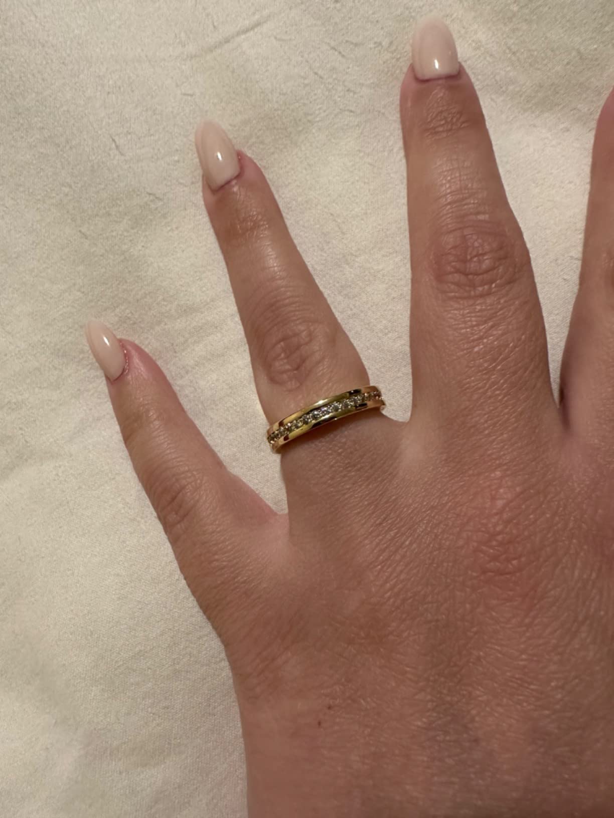 "Bought this as a promise ring to myself after finishing grad school. It fits like it was made for me and feels like an everyday reward. The band is smooth, doesn’t catch on anything, and I get compliments constantly. I’ve stacked it with two thinner bands and it looks designer."