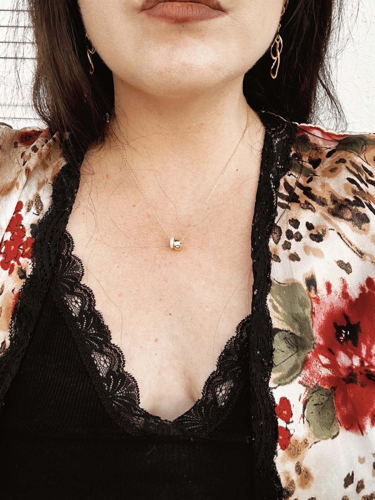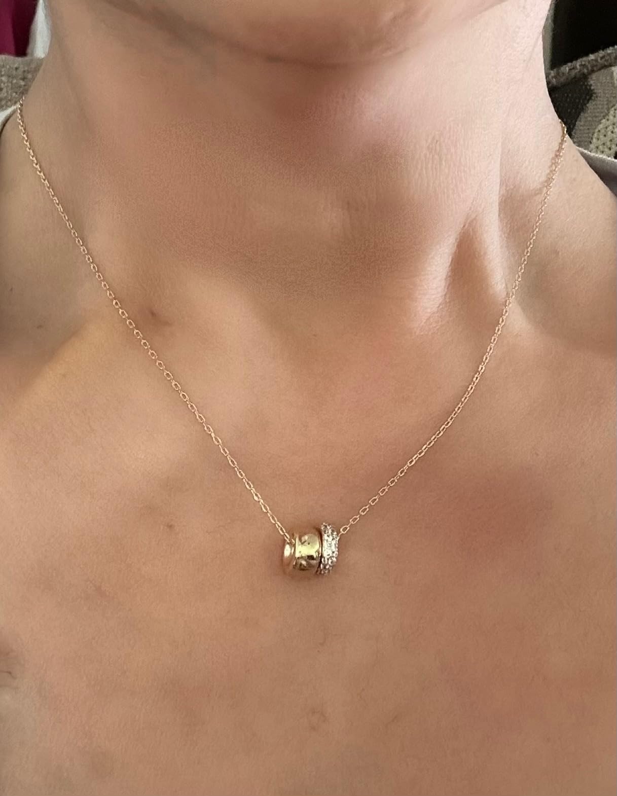 I've been wearing this necklace non-stop since I got it and receive compliments every time! The dual circle design is unique yet timeless, and the zirconia catches light beautifully. The sliding chain is so convenient for different outfits. Amazing quality for the price!