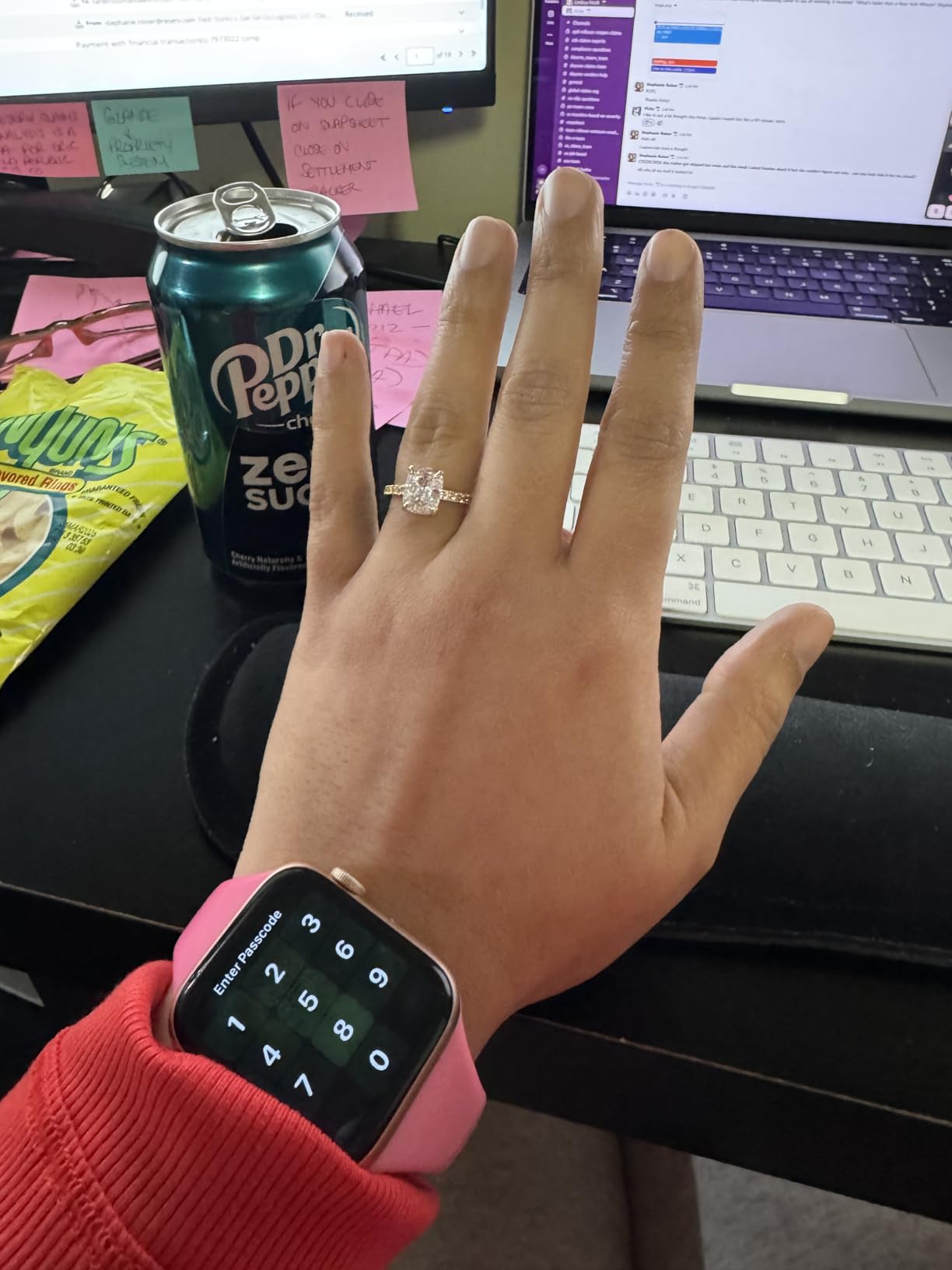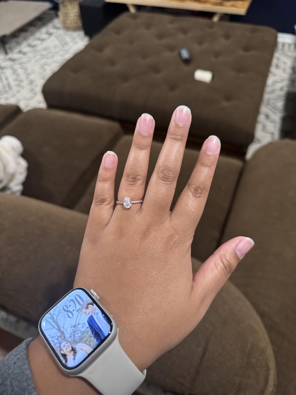"We’re on a budget but still wanted a special ring for our engagement, and this exceeded every expectation. The center stone is clear, bright, and full of fire, and the smaller accents give it that high-end look. I cried when he proposed. Everyone keeps asking where he got it!"