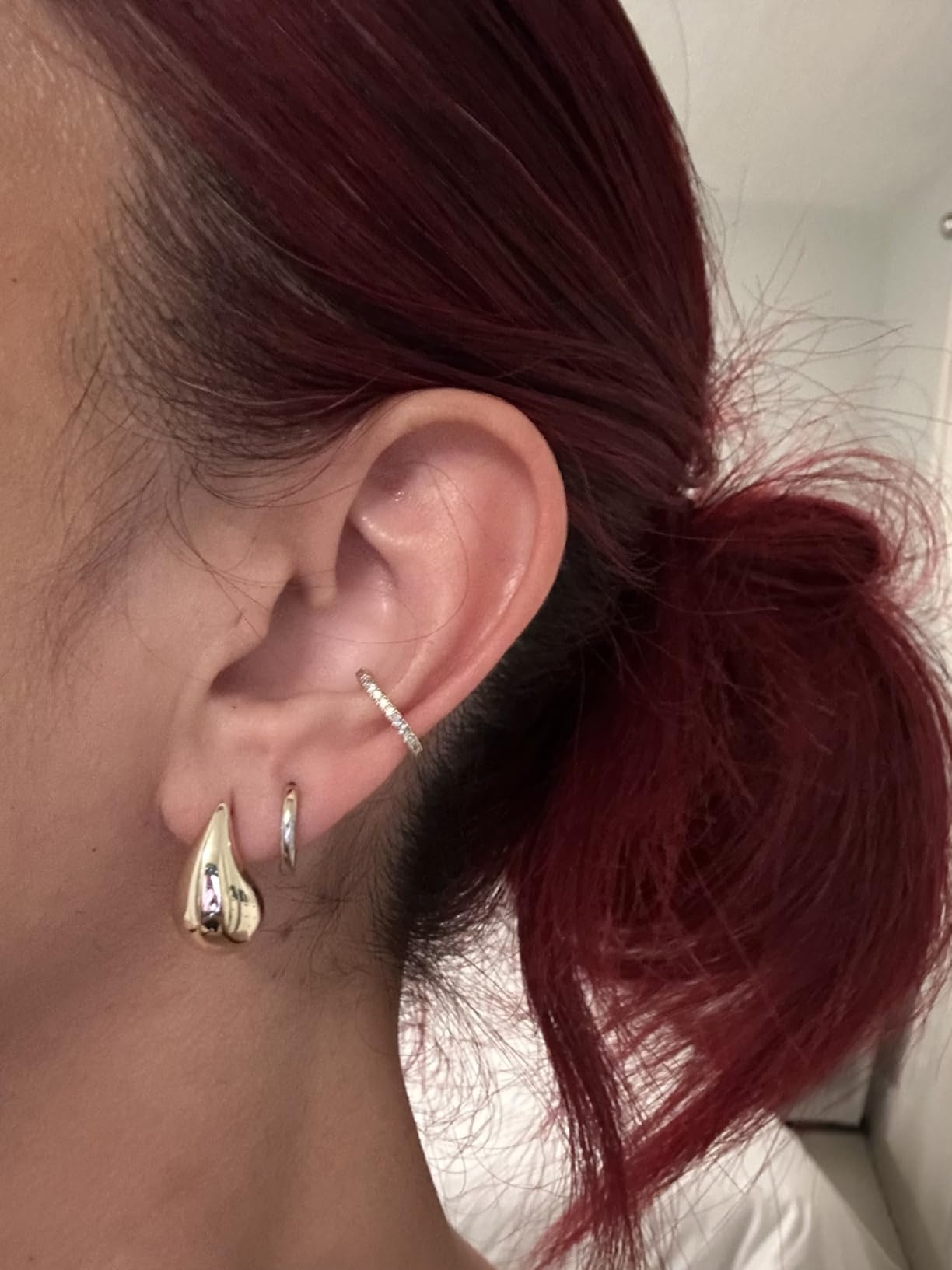 These teardrop hoops strike the perfect balance between statement piece and everyday wearable! The design is elegant and eye-catching without being too bold. They're surprisingly lightweight and comfortable for their size. The gold plating is beautiful and has a luxurious shine. I've received countless compliments every time I wear them!