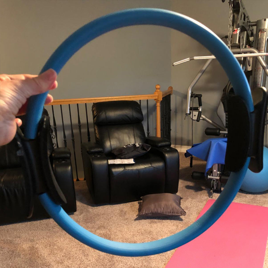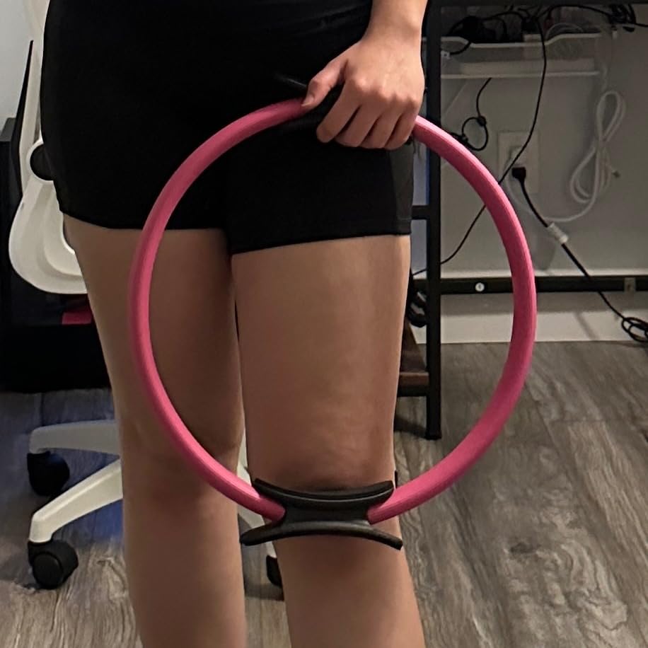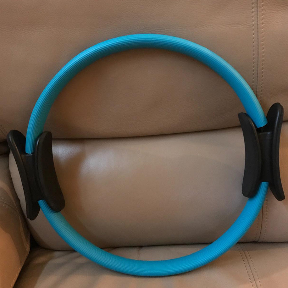 Sit, legs out, ring in hands. Lift into a V shape, squeezing the ring. Hold, engaging your core, then lower. Strengthen core and balance in each V-sit hold.