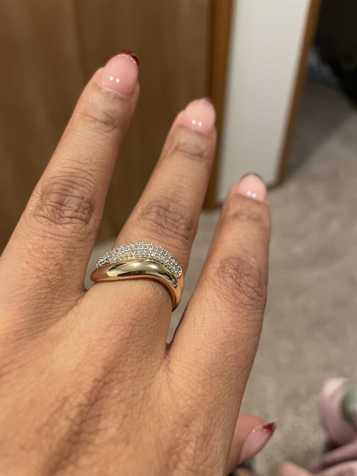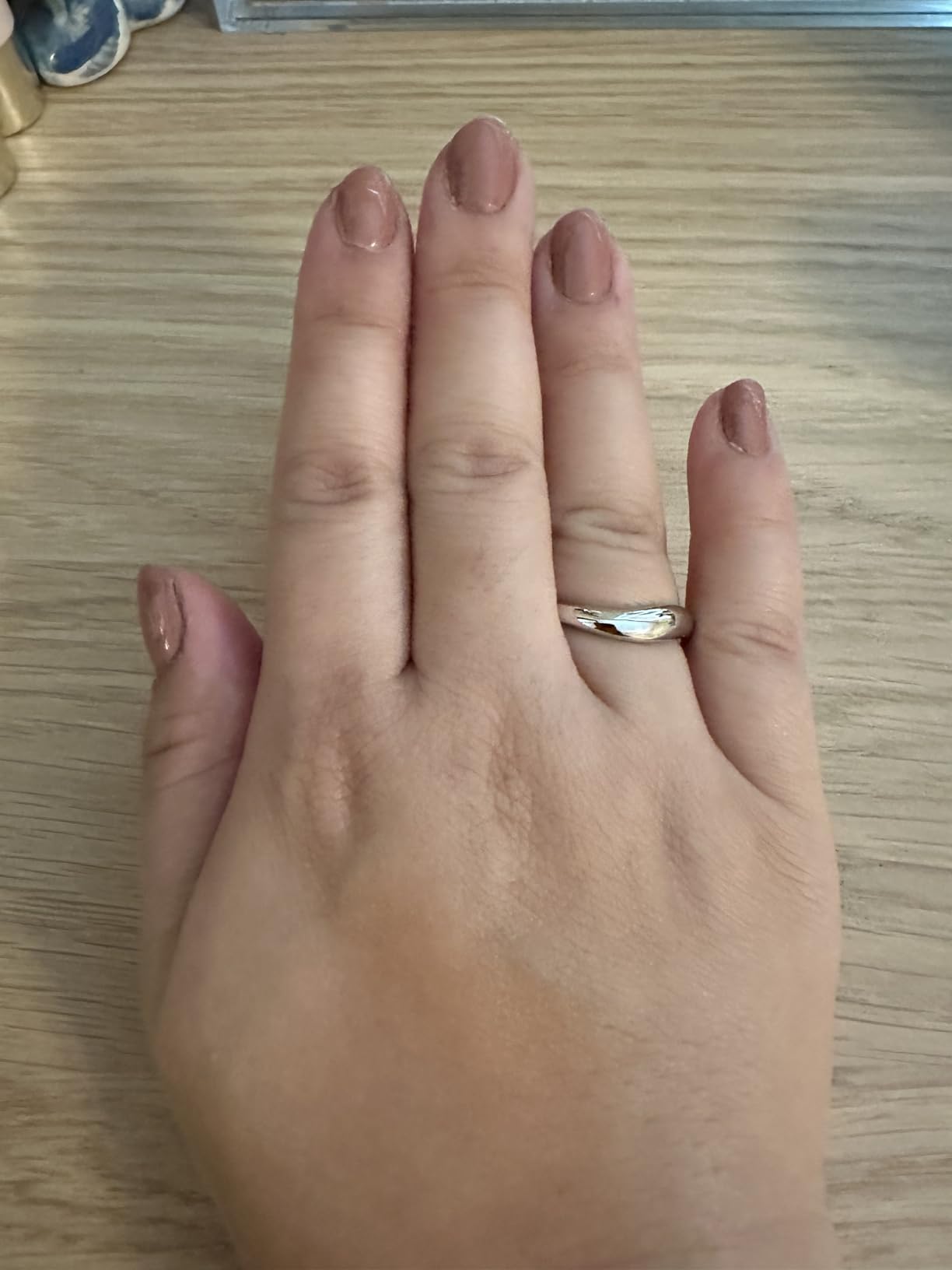 "Was looking for something understated but stylish to wear to work and this ring is it. The design is modern without being flashy, and the gold tone feels expensive. I’m constantly typing, and it hasn’t scratched or faded. Love that it's hypoallergenic—my fingers didn’t turn green like they have with other rings in this price range."
